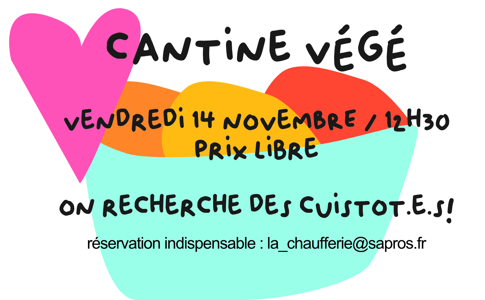 La cantine du mois aura lieu vendredi 14 novembre à partir de 12h30. Venez partager un repas végétarien, et si vous avez le temps, participer à la cuisine à partir de 9h30. Comme papoter c'est toujours mieux autour d'un repas qui frémit, n'hésitez pas à passer nous donner un coup de main, ou encore mieux, […]