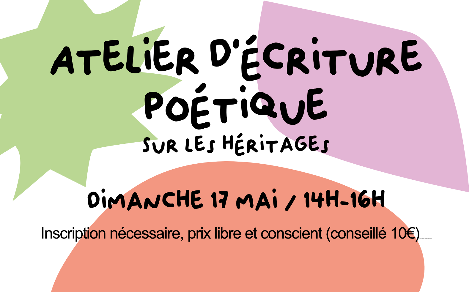 Atelier 4 : Mémoires de peaux dimanche 17 mai - de 14h à 16h Ce cycle d’ateliers d’écriture poétique est un espace pour explorer à travers les mots ce dont on hérite et ce qu’on transmet - récits vécus ou légendés, images volatiles, vibrations souterraines, mémoire de peaux. 💐 Il est possible de participer à […]