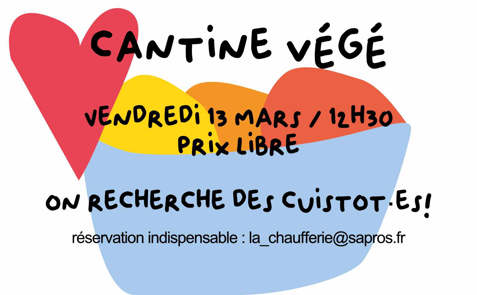 La cantine du mois aura lieu vendredi 13 mars à partir de 12h30. Venez partager un repas végétarien, et si vous avez le temps, participer à la cuisine à partir de 9h30. Comme papoter c'est toujours mieux autour d'un repas qui frémit, n'hésitez pas à passer nous donner un coup de main, ou encore mieux, […]