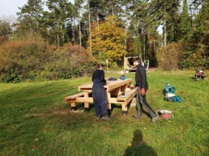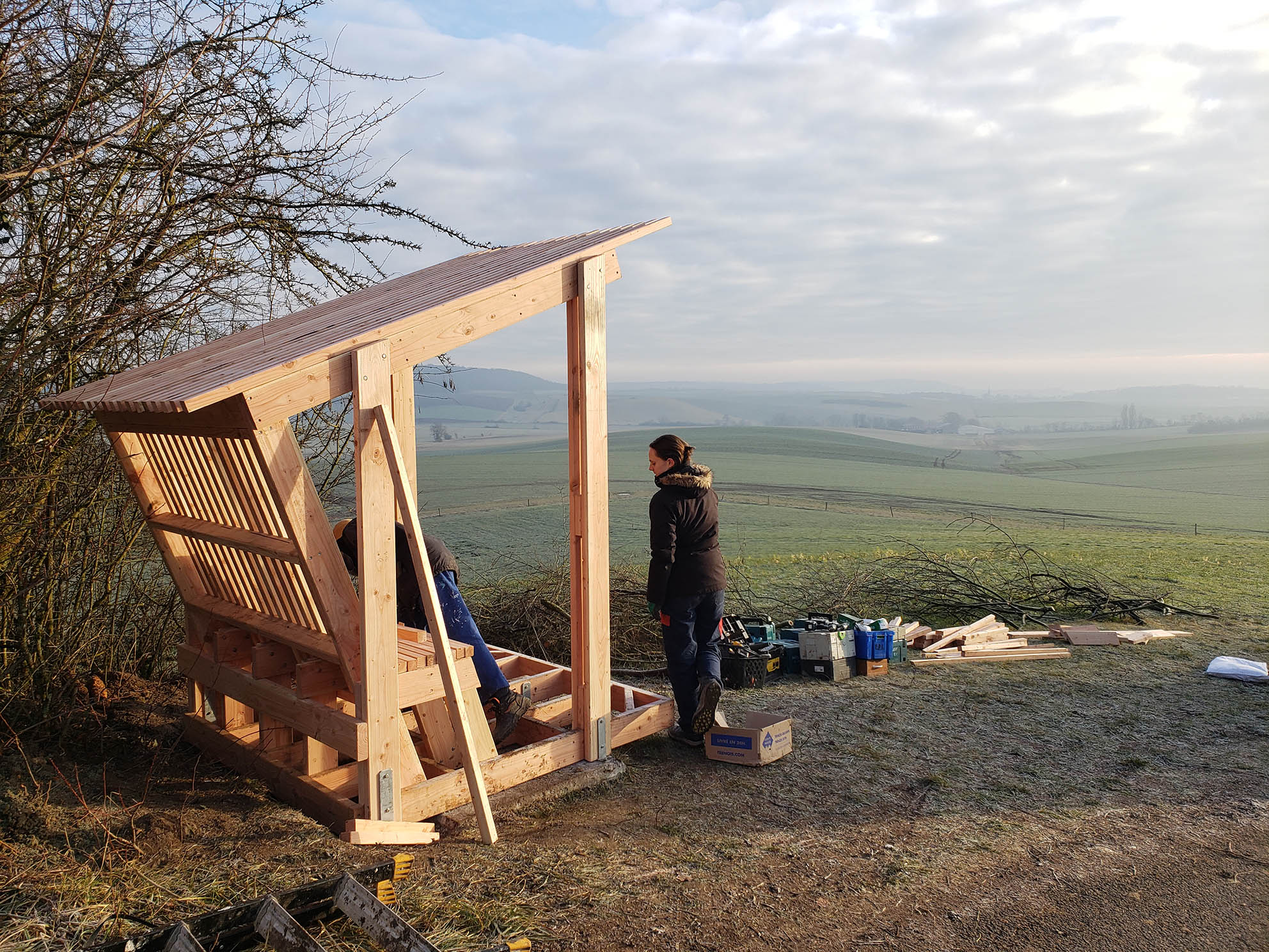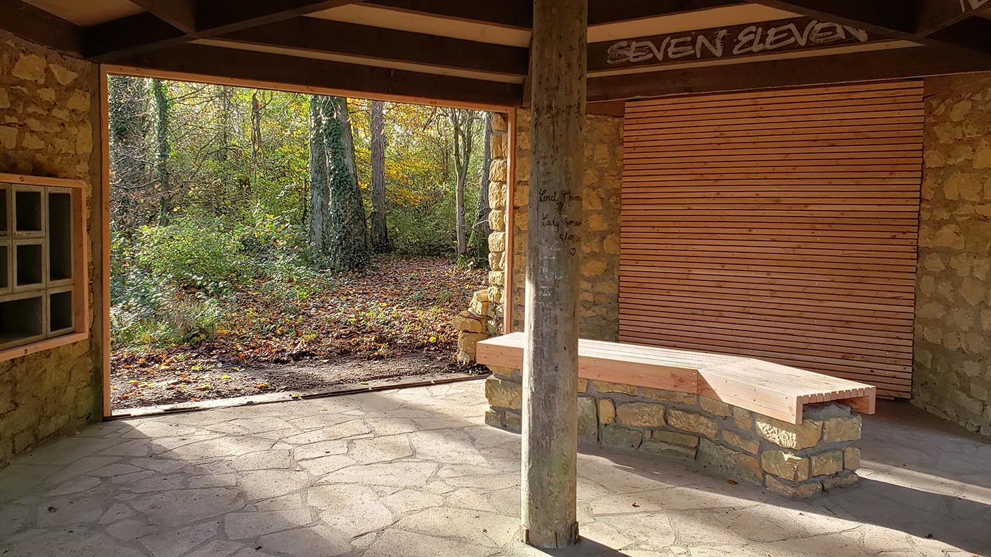 Rénovation d'un ancien kiosque d'information en abris pour les randonneur.euses, plantation d'arbres avec les enfants de l'école et construction d'une table de pique-nique dans la clairière voisine.
