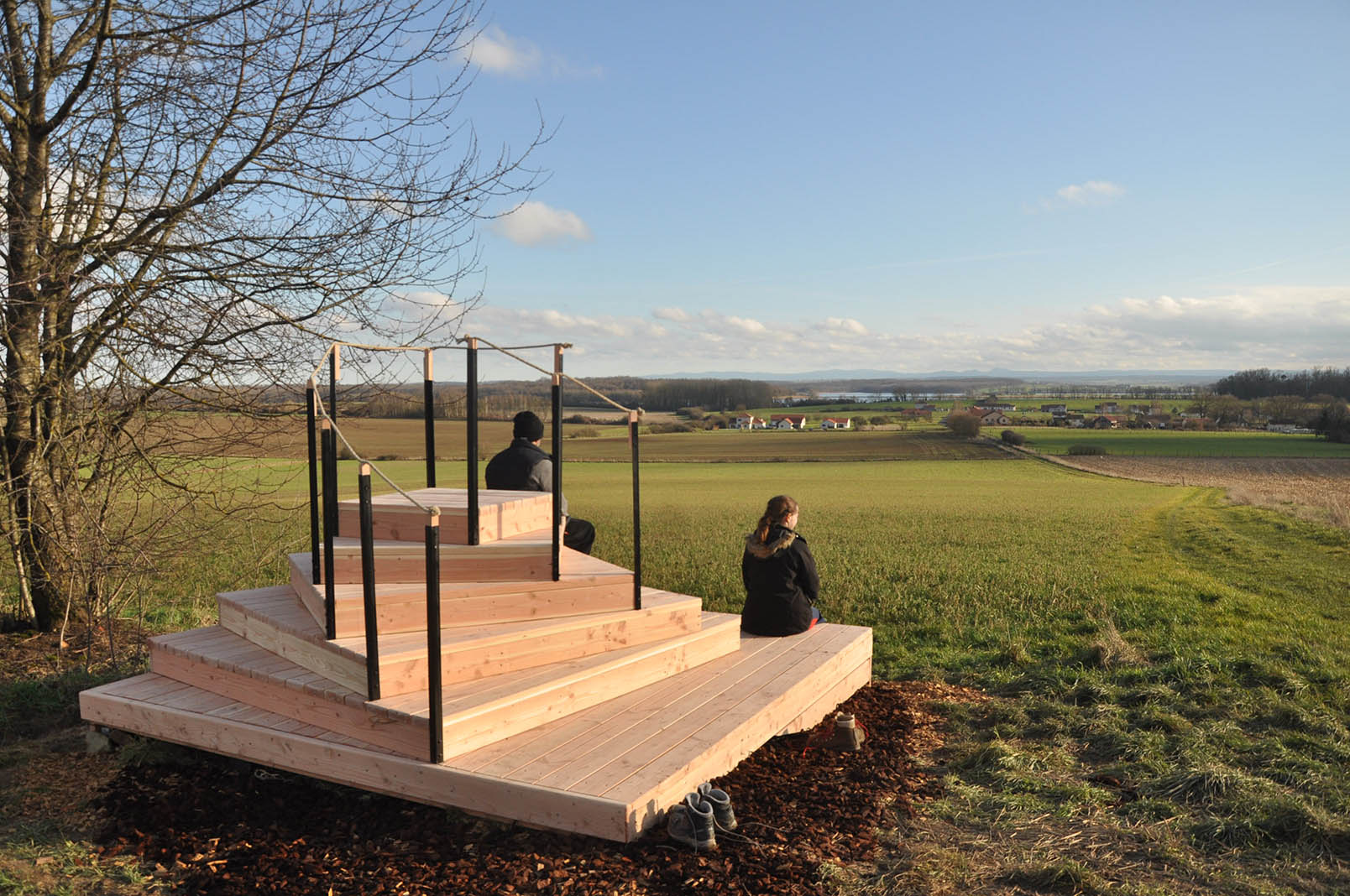 Sous un chêne centenaire, à proximité directe d'une ancienne carrière de pierre calcaire, nous invitons les promeneurs à sortir du bois pour se connecter au grand paysage. Après avoir extrait les pierres de l'ancienne carrière, et ouvert l'espace, nous avons réalisé des bancs en pierre sèche.