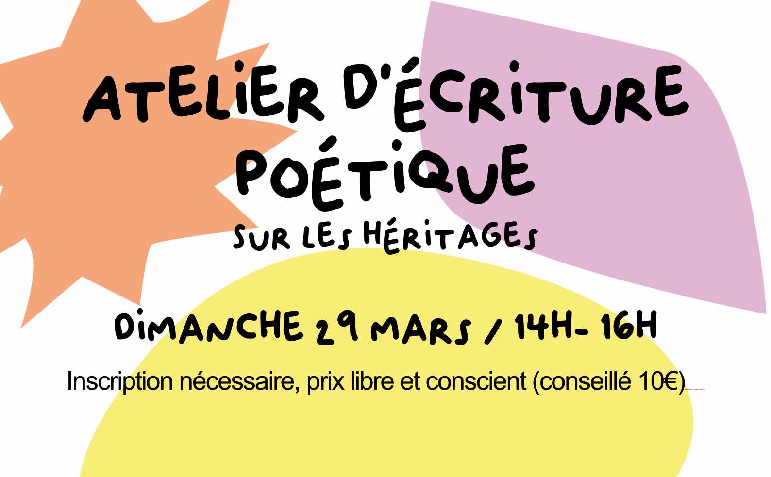 | prix libre et conscient (10€ conseillé) Pensez à arriver un peu avant le début de l’atelier et à apporter de quoi écrire ! A très vite ✨ |